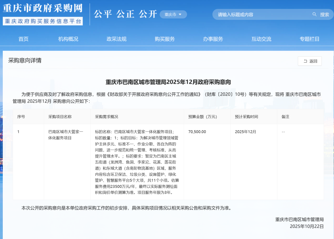 环卫在线网讯,2025年10月22日,重庆市巴南区城市管理局发布了2025年12月政府采购意向正规的实盘股票配资平台,其中,巴南区城市大管家一体化服务项目预计在12月进行采购,3年总预算为7.05亿元。