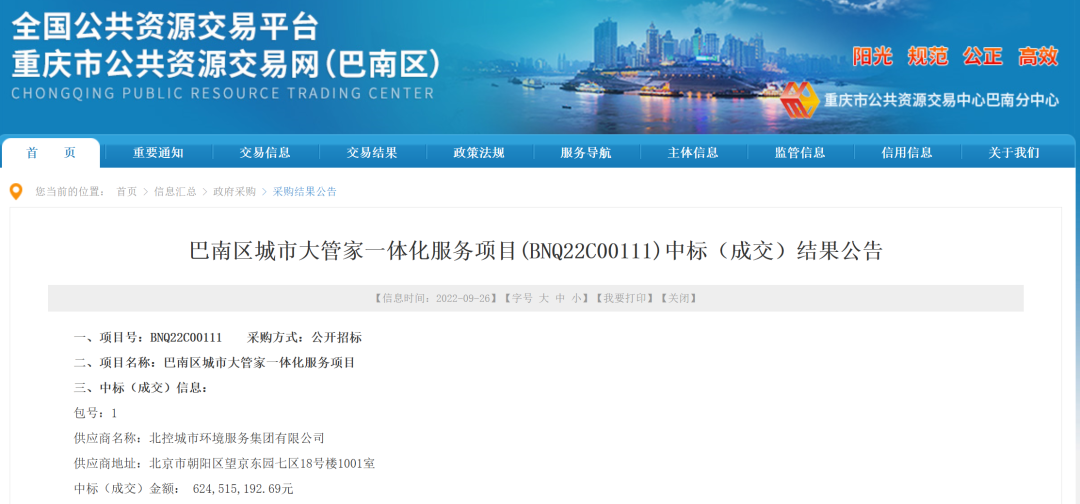 2022年9月,上一轮巴南区城市大管家一体化服务项目中标供应商为北控城市环境服务集团有限公司与重庆耐德环境技术有限公司联合体,中标金额约6.25亿元(3年),服务采取“3+3+3”模式,包括环卫保洁、垃圾收运、设施管护、绿化管护、智慧城管应用创新服务和合同履约过程中采购人要求的其他与城市大管家服务相关的工作。