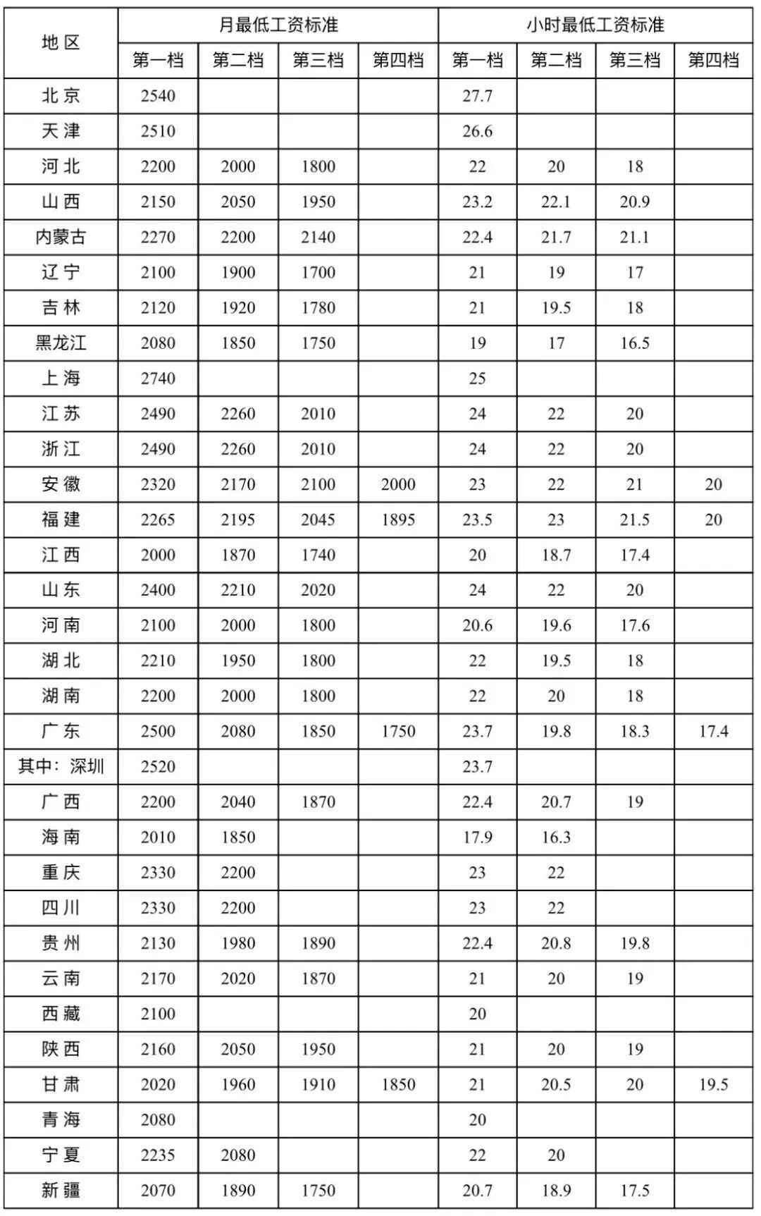 最低工资标准档位最多为四档。
